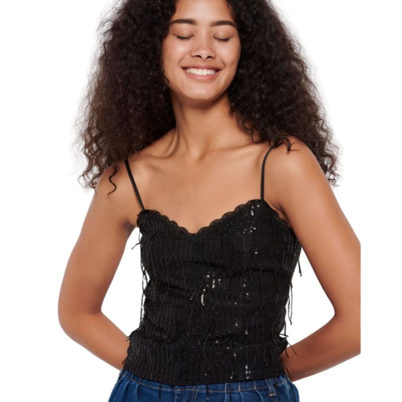 Top damă negru cu bretele subțiri și paiete 25ALX09031