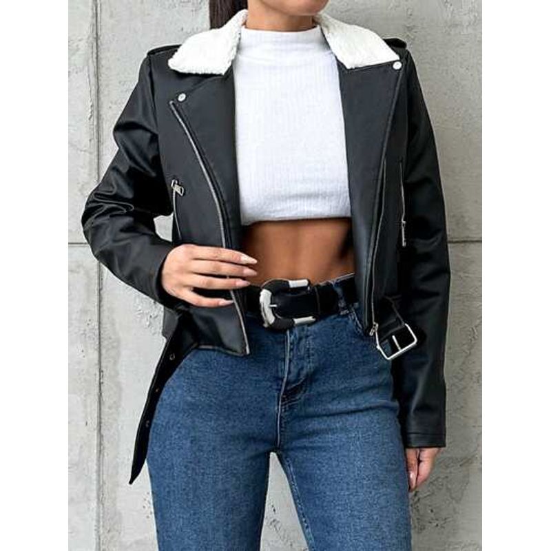 Geacă biker cu guler din blăniță și curea decorativă 25MEX11018