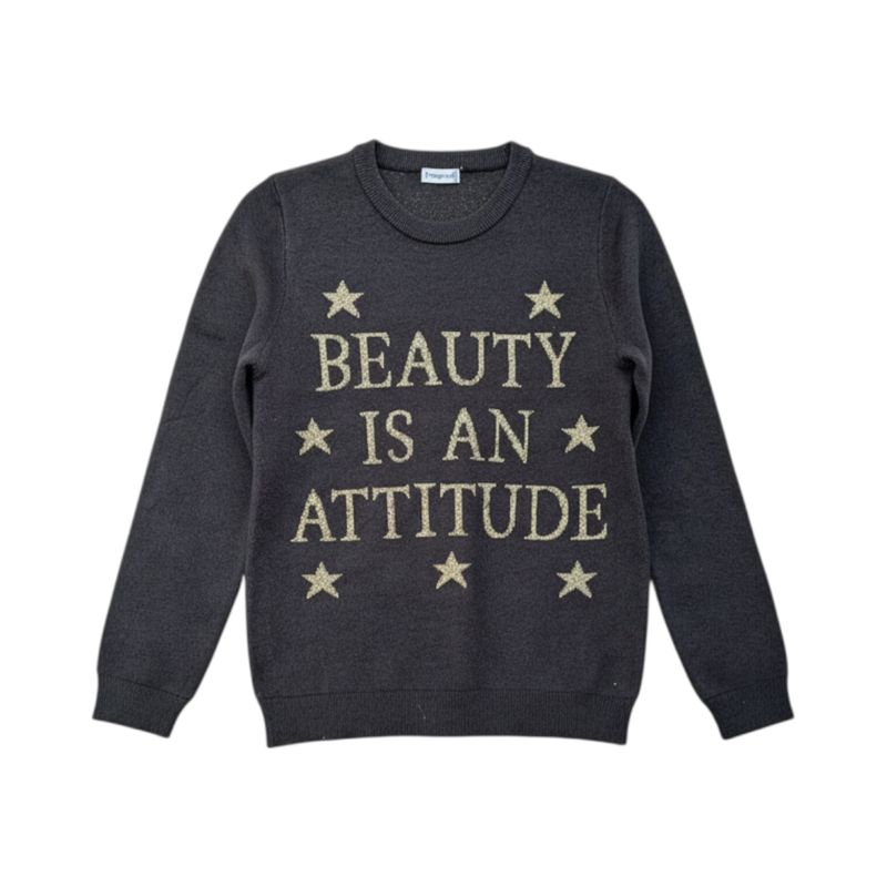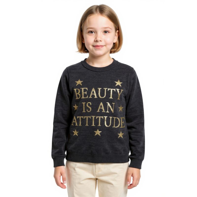 Pulover Fete Negru Tricotat cu Mesaj și Glitter Auriu 25MKF06001