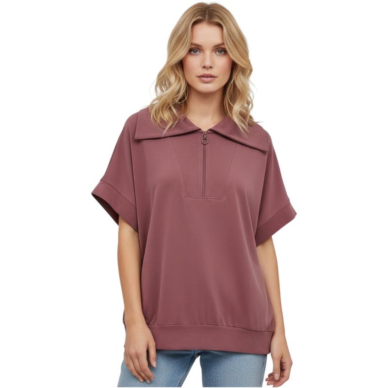 Bluză damă lejeră cu fermoar și guler supradimensionat 25ZEN36004
