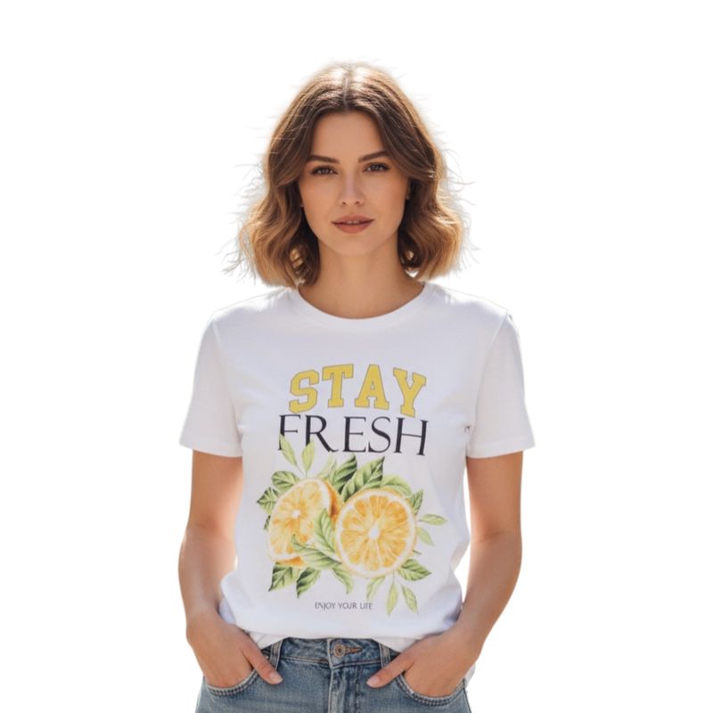Tricou damă din bumbac 100% alb cu imprimeu „Stay Fresh” 26MUR04006